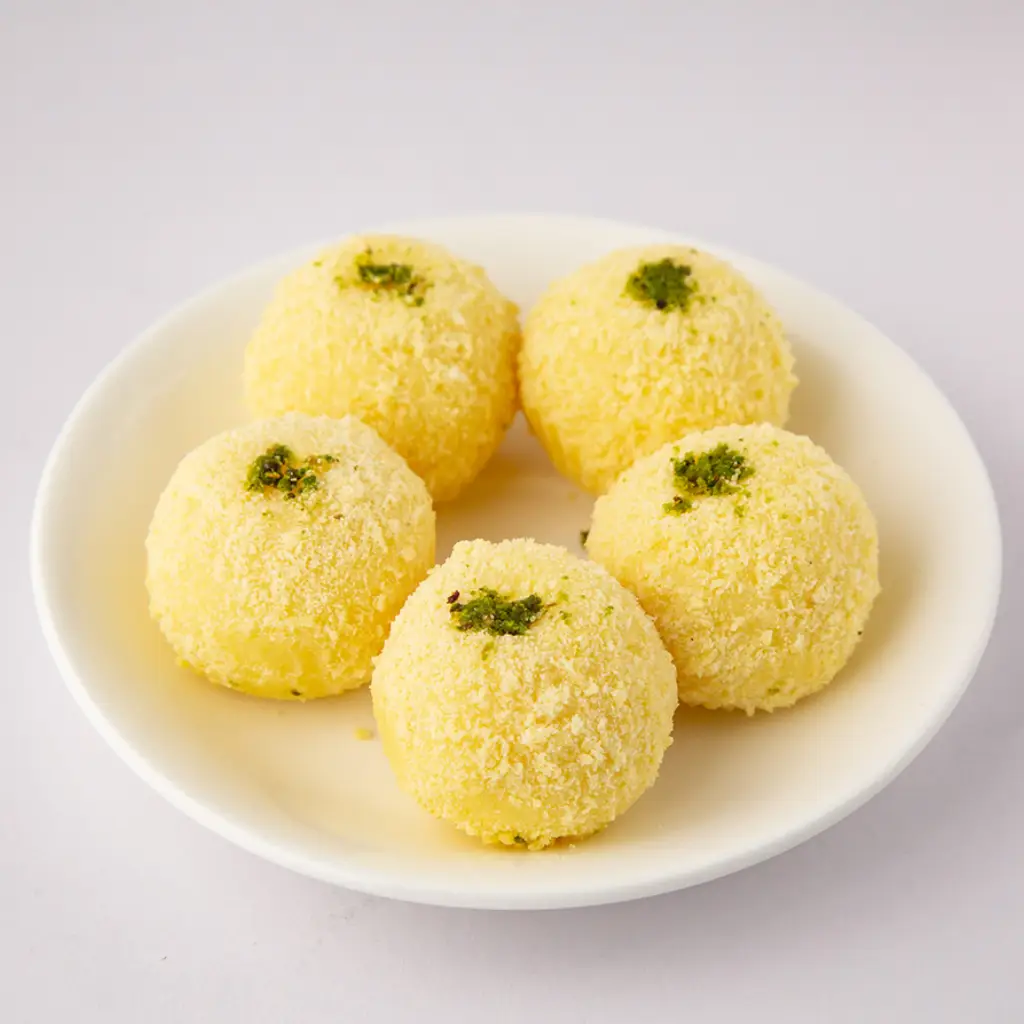 Rasgulla wrapped in khoya, coated with sugar—one bite, two textures, endless sweetness.